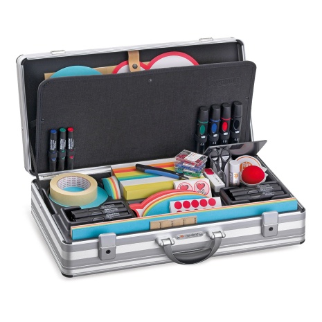 Dës Moderationsvalise enthält all Materialie fir Workshopen, Seminairen an soss Veranstaltunge professionell moderéieren a leeden ze kënnen.