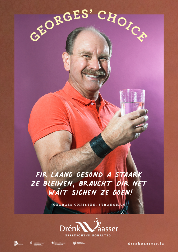 De 5. Pouster vun eiser Drénkwaassercampagne an Zesummenaarbecht mat dem Ëmweltministère, der Waasserverwaltung an der ALUSEAU, ass dobaussen. De stäerkste Mann vu Lëtzebuerg ënnerstëtzt eis mam Sproch: “Fir laang gesond a staark ze bleiwen, braucht dir net wäit sichen ze goen!”.