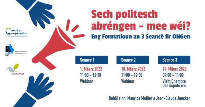 Eng Formatioun an 3 Seancë fir ONGen, déi sech mam politesche System zu Lëtzebuerg auserneesetze wëllen, fir an hirem politeschen Handele méi en direkten a geziilten Afloss kënnen ze huelen.