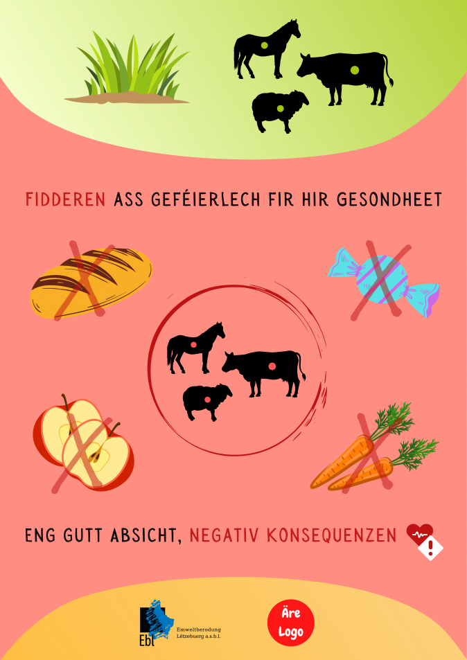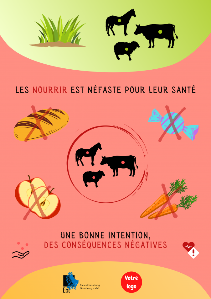 E flott Plakat wat genotzt ka gi fir d’Léit frëndlech drop opmierksam ze maachen, verschidden Déiere wéi Päerd, Kéi a Schof, net ze fidderen. D’Plakat kann individuell mat Ärem Gemengen- oder Betribslogo ugepasst ginn. Och Privatleit kënne sech iwwer info@eblsite.moloko.lu bei eis mellen. Mir hëllefen iech weider.