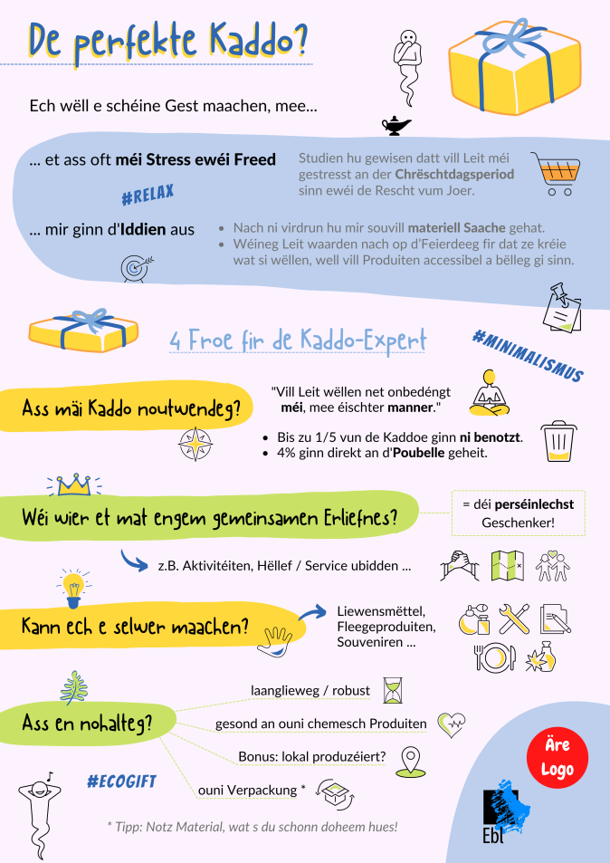Mëttlerweil ginn et sou vill Occasioune fir Geschenker ze maachen, datt engem oft d’Iddien ausginn an et méi Stress ewéi Freed ass déi laang Lëscht vu Geschenker ze besuergen. Dobäi kënnt och datt mir nach ni virdru souvill materiell Saachen hate wéi hautdesdaags.