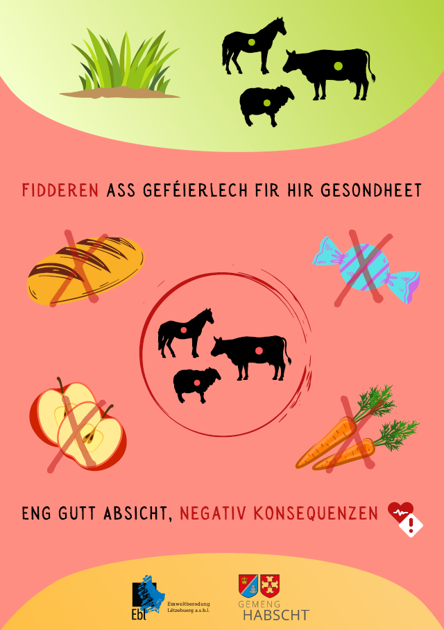 E flott Plakat wat genotzt ka gi fir d’Léit frëndlech drop opmierksam ze maache, verschidden Déiere wéi Päerd, Kéi, Schof a sou weider, net ze fidderen. D’Plakat kann individuell mat Ärem Gemengen- oder Betribslogo ugepasst ginn. Och Privatleit kënnen sech iwwer info@eblsite.moloko.lu bei eis mellen. Mir hëllefen iech weider.